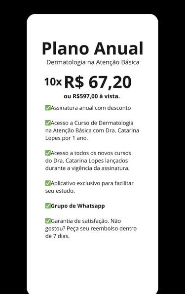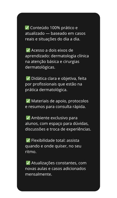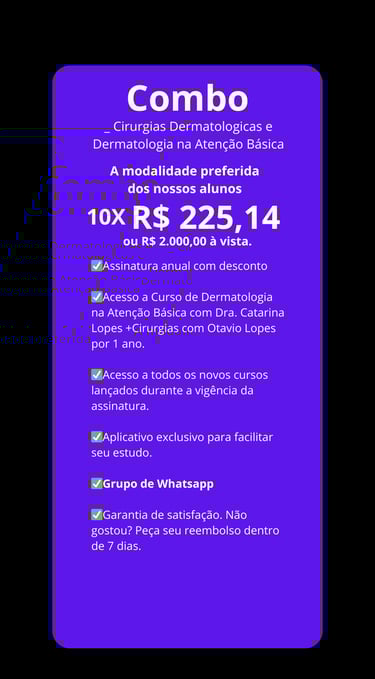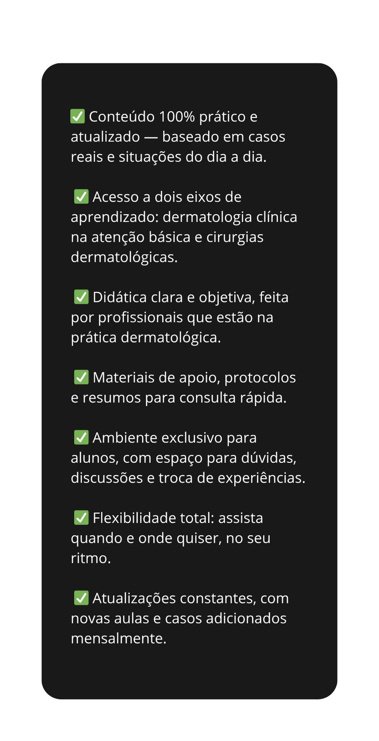 Tudo é pensado para que você consiga entender, reconhecer e conduzir os casos dermatológicos com segurança, seja no ambulatório, no posto de saúde ou no consultório.